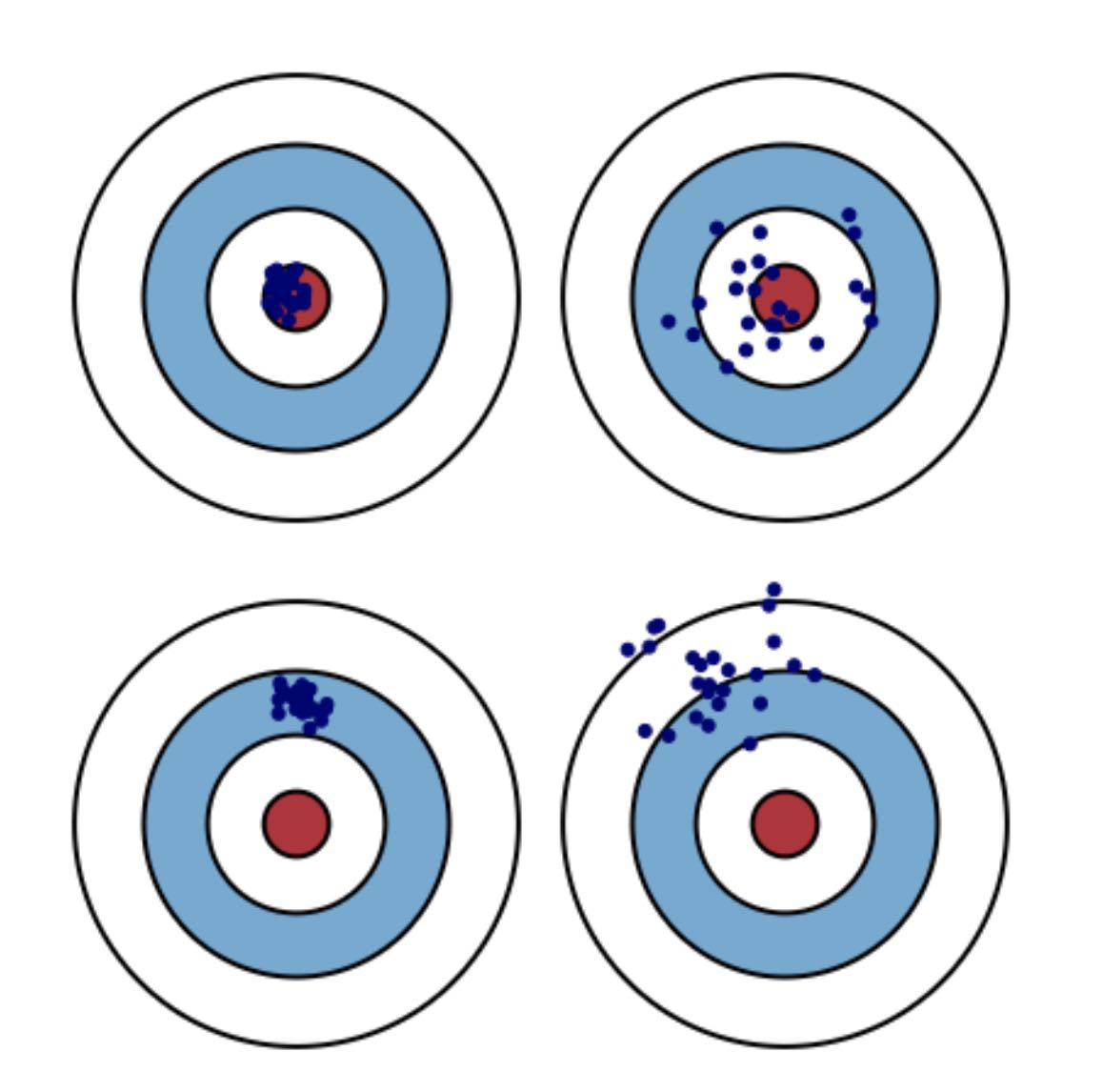 左下角, low variance, high bias;
